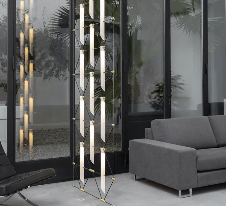 À la fois luminaire et panneau séparateur selon la version choisie, c’est une collection à la fois architecturale et modulable qui s’inscrit dans l‘espace.