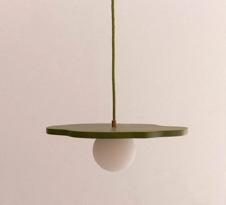 Découvrez la suspension Nénuphar petit par Little Anana, une création en bois de bouleau au design organique et à la teinte verte, façonnée artisanalement en France.