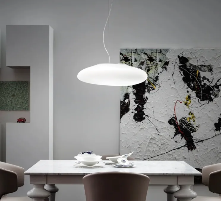 Conçue en 2013 et fabriquée en Italie, cette suspension en verre blanc de 45 cm de diamètre et 15 cm de hauteur s’intègre parfaitement dans tout intérieur moderne.