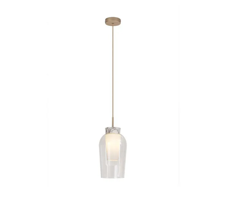 D’une forme ovale, cette suspension présente un diffuseur blanc surmonté d’un abat-jour en verre transparent, créant un éclairage diffus à 360 degrés. Son cylindre en finition marbre blanc relie le diffuseur au câble doré, ajoutant une touche naturelle à la structure.