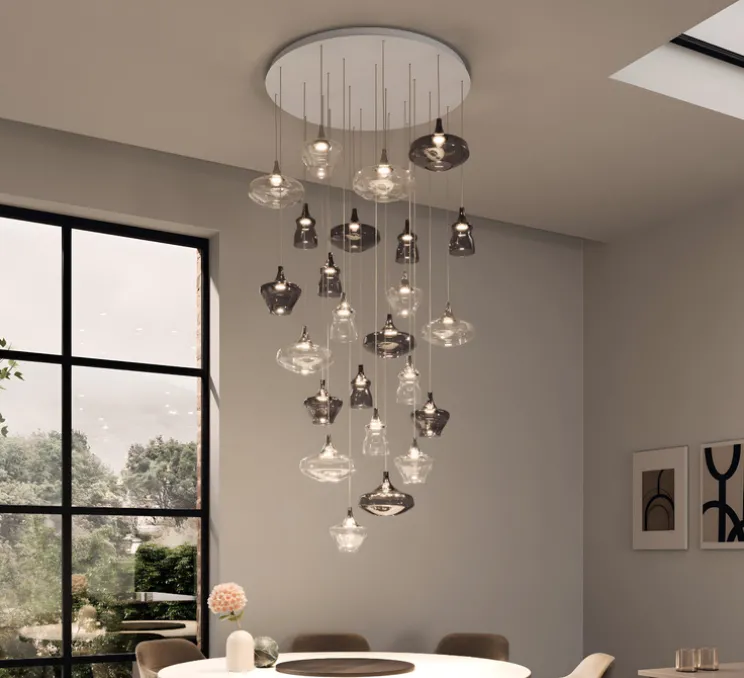 Ce luminaire se compose de 24 suspensions aux finitions gris fumé et cristal, suspendues à une rosace circulaire blanche, pouvant être personnalisée selon vos préférences. Avec huit suspensions Nostalgia Small, sept suspensions Nostalgia Medium et neuf suspensions Nostalgia Large, cette création offre un éclairage diffus à 360°, créant une ambiance chaleureuse et élégante. Le câble gris de chaque suspension mesure 3,8 m de longueur, assurant une grande liberté d’installation.