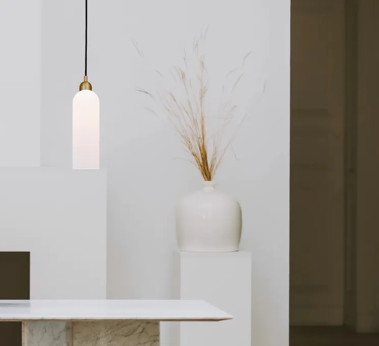 Une cloche arquée plane en dispersant gracieusement la lumière à travers des couches de verre. Soufflés dans des moules en fonte, ces cylindres opalins se distinguent par leur forme unique et classique.