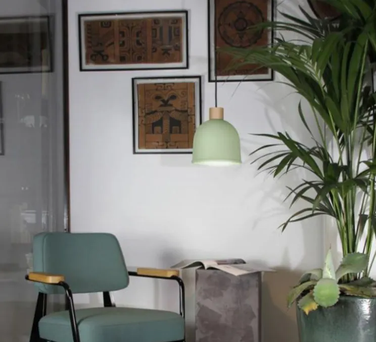 Ons is a suspension composed of a bell-shaped metallic shade, with a beech element that leads to a black textile cable. Its name comes from the estuary of the Pontevedra river, that opens onto the Galician islands of Ons; outlines formed of large coves and cliffs, the islands of Ons hide caves dug by the ocean, called “furnas”. Minimalist yet expressive, Ons is a light that quickly finds its rightful place in a home. Its bright colours bring positive energy and a certain optimism in every room it is installed, whether it be above a dining table, in a bedroom or in a study.