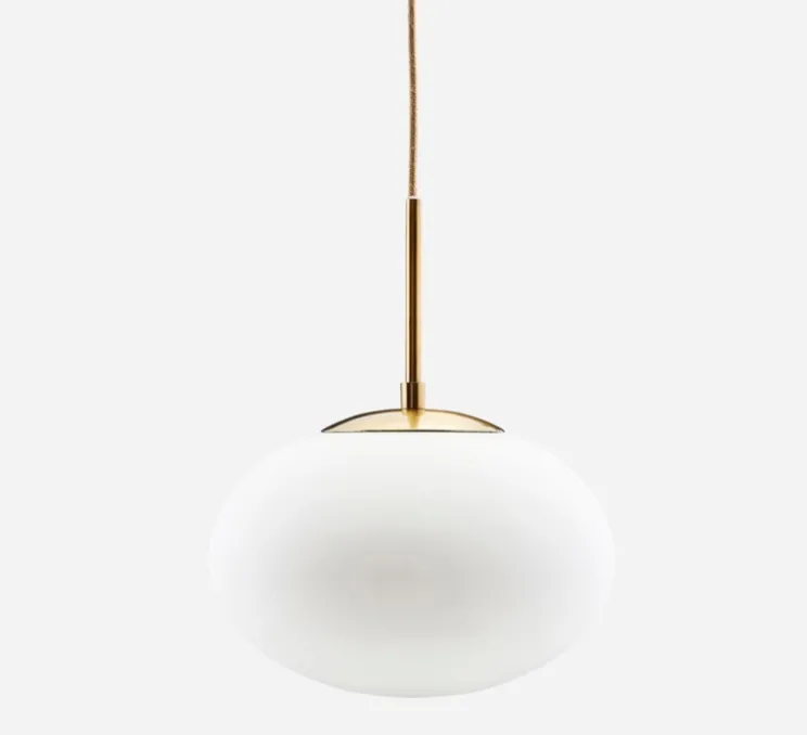 Ce luminaire est en forme de suspension boule. Son abat-jour est en verre opalin ce qui assure une diffusion agréable et douce de la lumière. Une tige en laiton surmonte cette sphère de verre pour lui apporter un côté chic et décoratif. Dans tous les styles d’intérieur cette suspension prendra sa place idéalement pour apporter lumière et chaleur. Cette suspension peut aussi bien être placée dans une chambre, qu’un salon ou encore une salle à manger. Son style et son design sont intemporels !