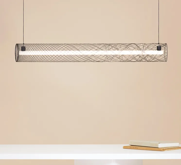 Ceci procure un effet d’optique de distorsion et rend alors chaque suspension unique. On retrouve idéalement cette suspension dans un séjour, une cuisine ou une salle à manger. Elle crée un jeu de lumière incroyable grâce aux fibres torsadées.