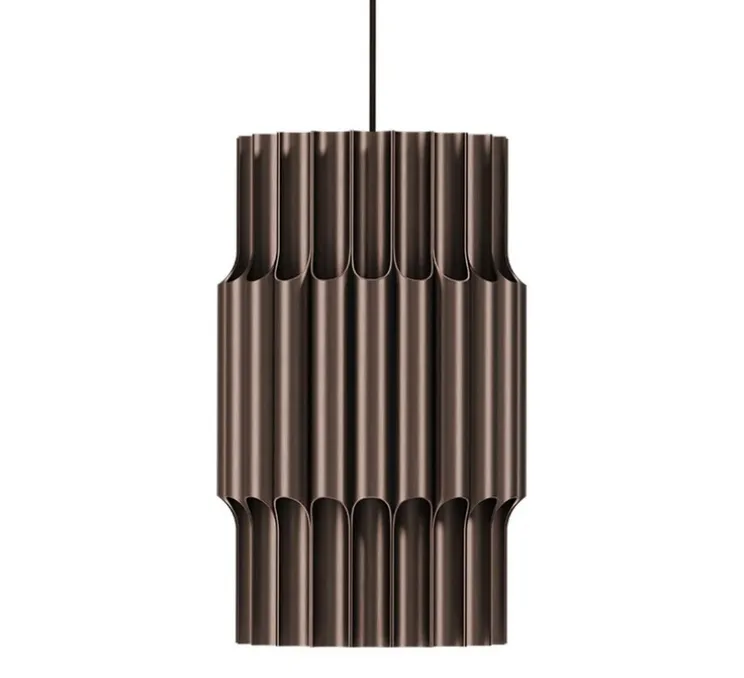 Son design emblématique allie fonctionnalité et esthétique, rendant hommage au style des années 70. Ce luminaire, fabriqué au Danemark, se distingue par sa forme cylindrique et sa structure en bronze anodisé, composée de 21 tubes en aluminium poli, évoquant les tuyaux d’une flûte de Pan.