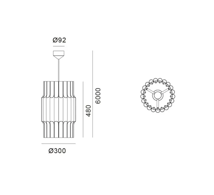 La suspension présente un diamètre de 30 cm, une hauteur de 48 cm et un câble noir de 6 mètres, ce qui la rend adaptable à divers types de plafonds. Elle offre une lumière indirecte et directe mais n’est pas dimmable. L’ampoule Led E27 d’une puissance de 60W n’est pas fournie mais est recommandée pour le bon fonctionnement du luminaire.