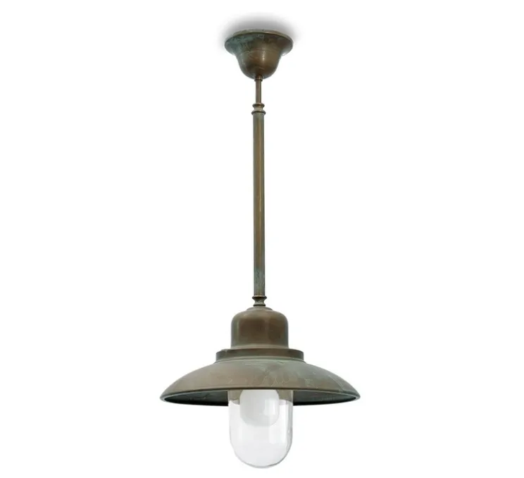 Voici la suspension extérieure Patio 1356 en laiton vieux cuivre du studio Moretti Luce.