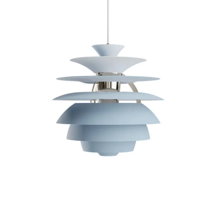 La forme sphérique de la PH Snowball repose sur un empilement de huit abat-jour en aluminium laqué bleu, soutenus par une structure en chrome. Le contraste entre les finitions brillantes sur le dessus et mates en dessous des diffuseurs crée une lumière douce, sans éblouissement. Sa silhouette architecturée convient aux intérieurs scandinaves ou modernes, suspendue au-dessus d’une table de repas, dans un salon ou un hall.