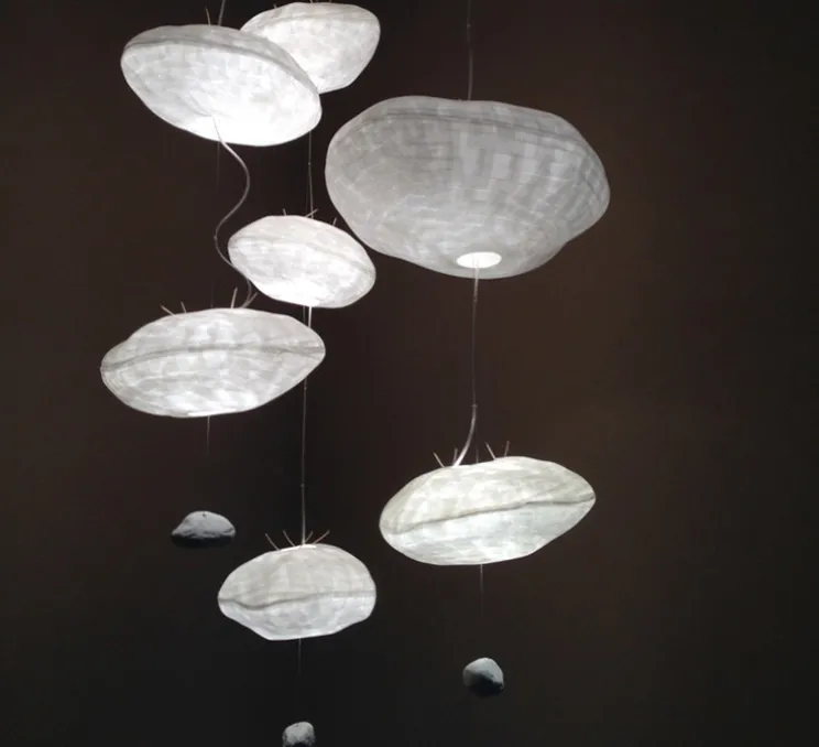 Le luminaire Points de Suspension est composé d’une accroche plafond, de trois abat-jours blancs faits de papier japonais en forme de météorite dont la hauteur peut se modifier le long d’un fil avec galet de leste en marbre blanc et d’un câble électrique avec branchement sol. Poétique et joueuse, la suspension Points de Suspension s’installe dans chaque espace, que ce soit une pièce de vie, une chambre ou une bibliothèque.