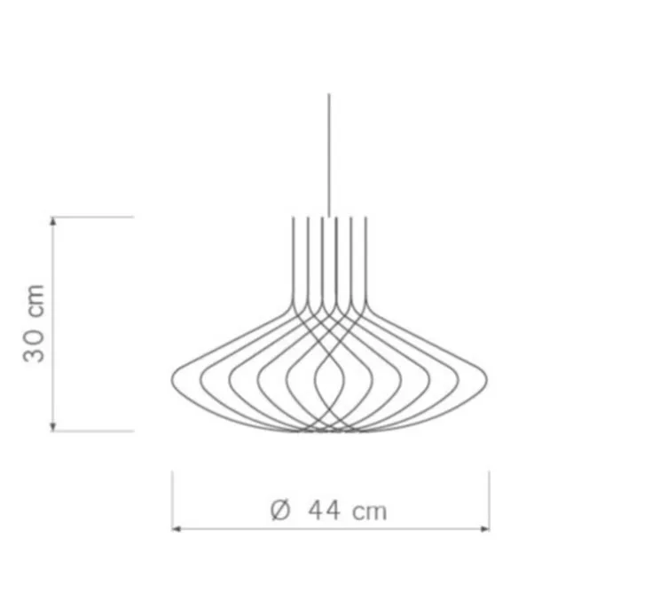 Son diamètre de 44 cm et sa hauteur de 30 cm en font un luminaire adapté aux pièces de petite à moyenne dimension. Sa silhouette organique, composée de pans ajourés, capte et diffuse la lumière différemment selon l’angle et le moment de la journée.
