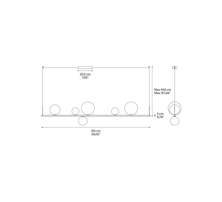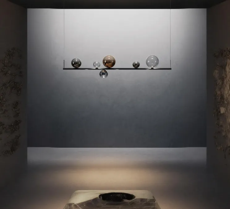 D’une grande flexibilité décorative, la suspension Random Stick long se distingue par ses dimensions généreuses de 150 cm de long et 2 cm de diamètre. A travers la disposition des diffuseurs sphériques de tailles variées (de 10 à 18 cm), la créatrice présente un luminaire au design subtile et poétique rappelant de fragiles bulles de savons prêtes à s’envoler dans les airs.