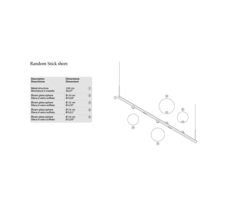 D’une grande flexibilité décorative, la suspension Random Stick Short se distingue par ses dimensions de 100 cm de long et 2 cm de diamètre. A travers la disposition des diffuseurs sphériques de tailles variées (de 10 à 14 cm), la créatrice présente un luminaire au design subtile et poétique rappelant de fragiles bulles de savons prêtes à s’envoler dans les airs.