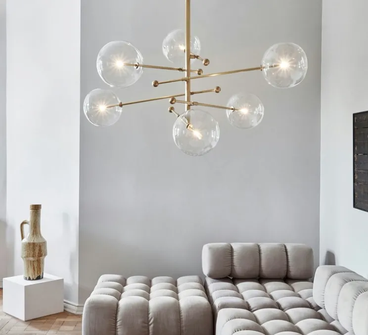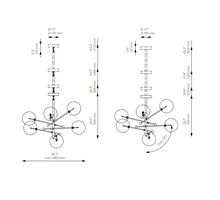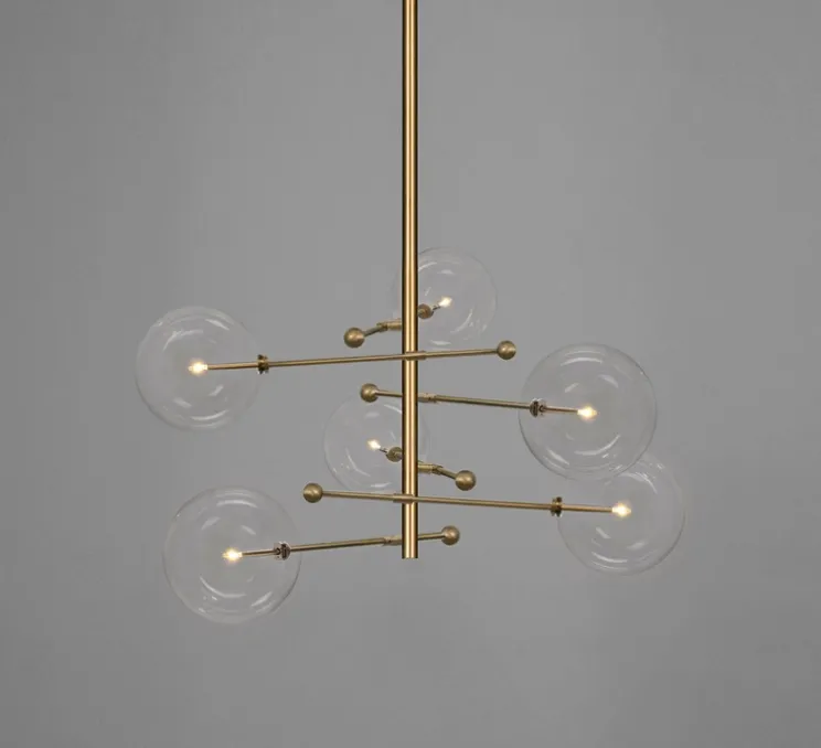 Ce lustre se compose de globes en verre soufflé à la bouche installés à l’extrémité d’une tige et gravitant en équilibre, autour d’un axe central. L’asymétrie forme une composition gyroscopique, apportant une élégance interstellaire à un intérieur.