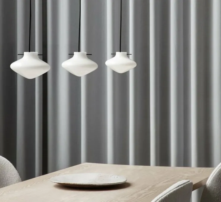 REPOSE est disponible en trois pendentifs de tailles différentes et en tant que lampe de table. Chaque pendentif a sa propre forme organique qui adopte la plasticité naturelle du verre et la façon dont il change de forme et de direction, plus il est grand. L’abat-jour de forme organique est soigneusement fabriqué à partir de verre soufflé à la bouche.