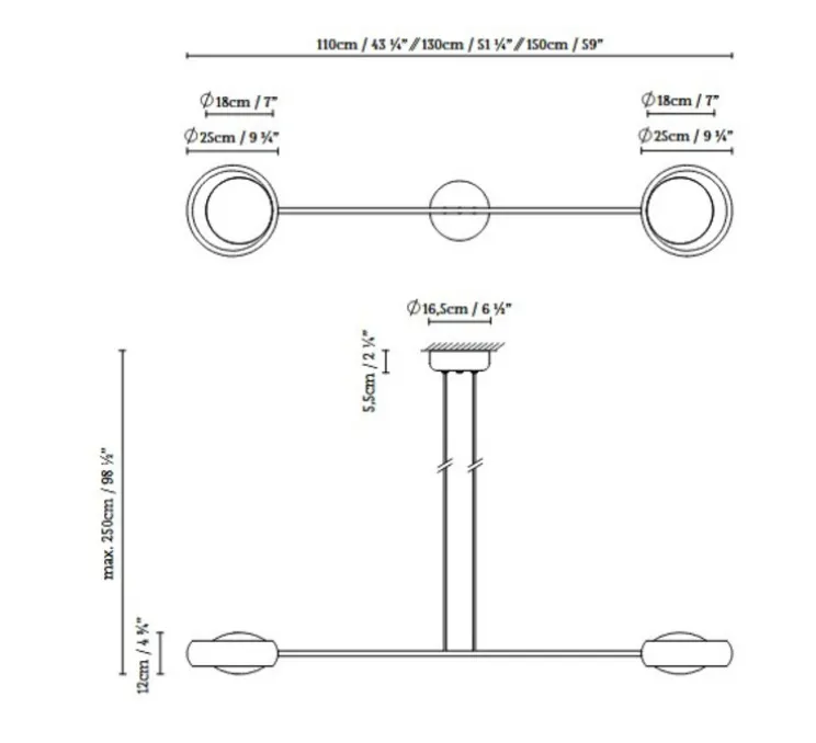 Ring S2 150 mesure 150 cm de longueur et est livrée avec son câble noir ajustable jusqu’à 2,5 m, pour une installation flexible. Cette suspension n’inclut pas de source lumineuse pour une personnalisation de l’intensité. Nous vous recommandons quatre ampoules E14 de 6W maximum.