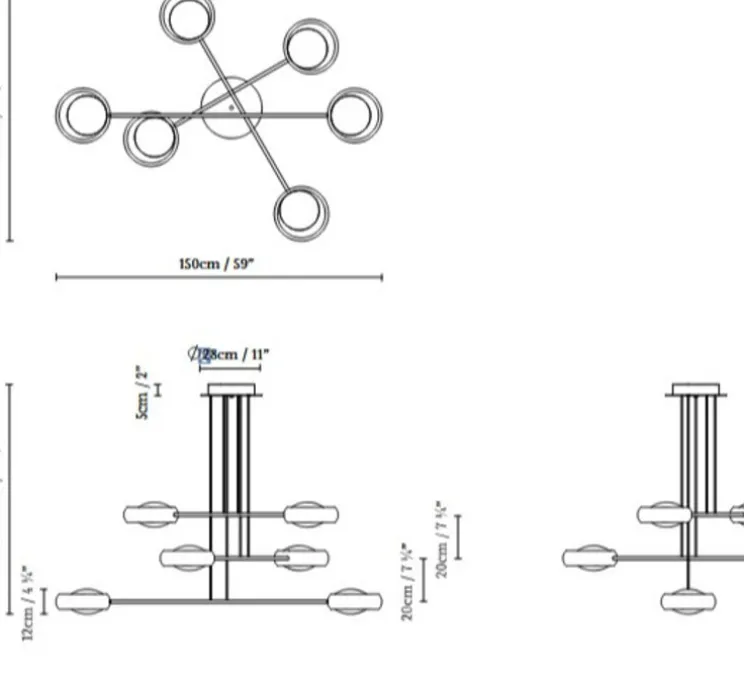 Ring S6 mesure 150 cm de longueur pour 116 cm de profondeur et est livrée avec son câble noir ajustable jusqu’à 2,5 m, pour une installation flexible. Cette suspension n’inclut pas de source lumineuse pour une personnalisation de l’intensité. Nous vous recommandons douze ampoules E14 de 6W et 45 mm maximum.