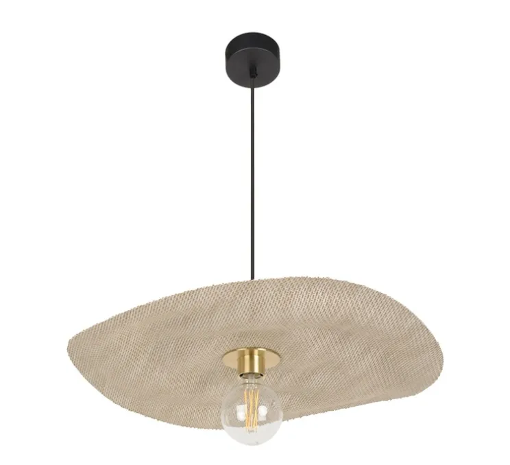 Cette suspension est composée d’une lumière avec abat-jour en matière Varian®. Equipée d’un cordon textile silicone d’une longeur d’1m50. Ainsi que une bague en laiton brossé et d’un pavillon en métal sablé adaptable DCL. La suspension mesure 58cm de diamètre. L’ampoule est non incluse, nous préconisons une ampoule E27-60W.