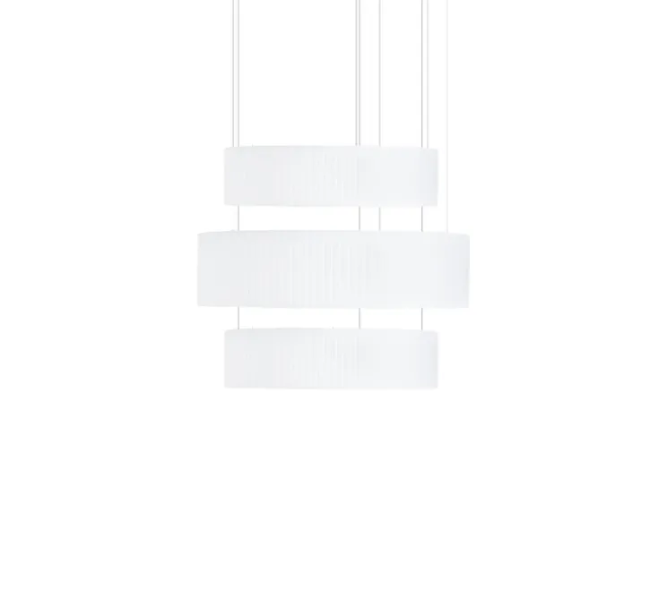 Ronde réinterprète de manière contemporaine le thème de l’abat-jour avec cette structure faite de ruban. L’abat-jour est évidé pour évoquer la légèreté des ronds de fumée. Elle est à la fois décorative et minimaliste. Sa géométrie simple habille l’espace et sa finesse incite à réaliser des compositions aériennes. Sa légèreté et sa finesse en font un élément décoratif aussi élégant que fonctionnel. Cette version composée de 3 abat-jour (60-80-60), apporte de l’élégance à votre intérieur et s’installe comme pièce maitresse de votre pièce.