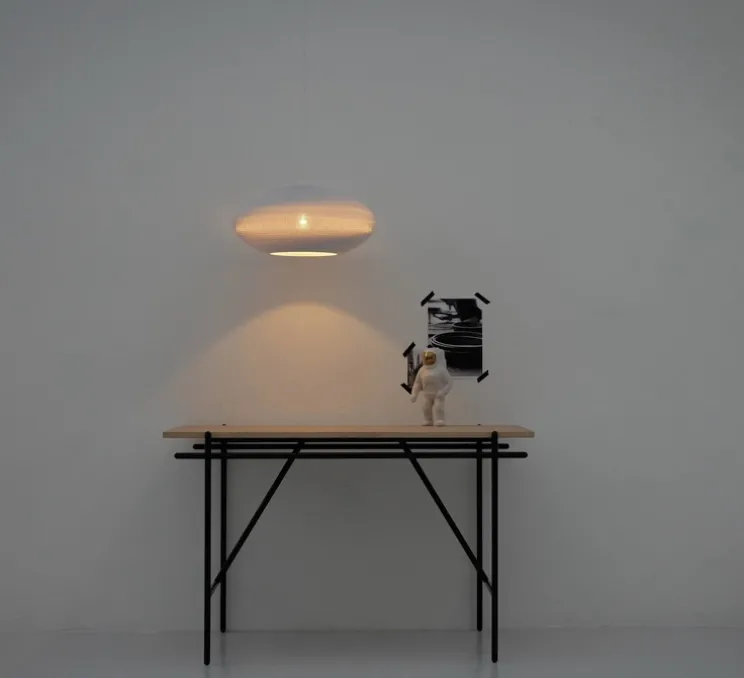 La suspension toute de blanc vêtue Disc 24, signée par les designers américains Seth Grizzle et Jonathan Junker, est constituée de fines strates de carton découpées au laser et assemblées à la main dans leurs studios à Amsterdam. Cette suspension reflète un engagement éco responsable.