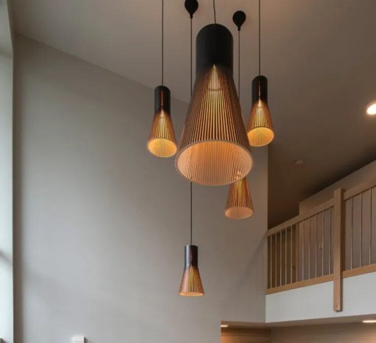 La lumière est dirigée vers le bas et s’échappe sur les côtés entre les lamelles. Le câble électrique et la rosette sont noirs, pour la version en stratifié noir, et blancs pour les trois autres versions. Ampoule LED incluse.