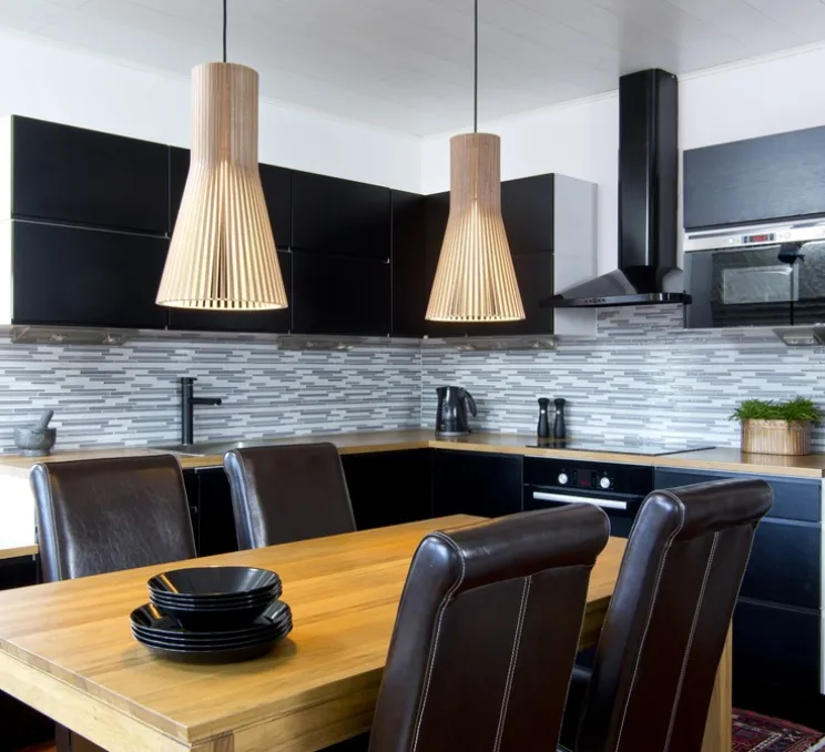 La lumière est dirigée vers le bas et s’échappe sur les côtés entre les lamelles. Le câble électrique et la rosette sont noirs, pour la version en stratifié noir, et blancs pour les trois autres versions. Ampoule LED incluse.