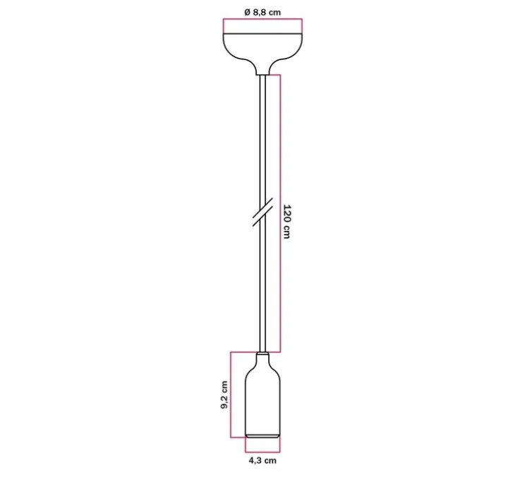 La suspension mesure 4,3 cm de diamètre et 9,2 cm de hauteur, avec un câble en coton noir charbon d’une longueur de 1,2 mètre. Elle diffuse une lumière à 360 degrés, parfaite pour un éclairage d’ambiance. L’ampoule E27 d’une puissance maximale de 53W n’est pas fournie mais est recommandée pour le bon fonctionnement de la suspension. Le luminaire n’est pas dimmable. Rosace assortie incluse.