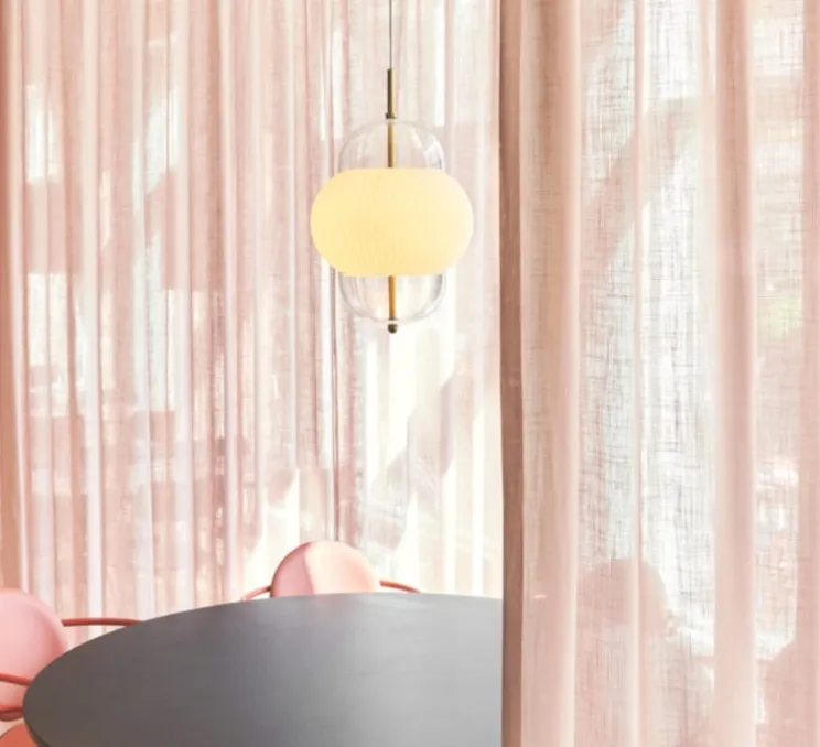 Voici la suspension Shahin de couleur opale, dorée et transparent du studio danois Design by us !