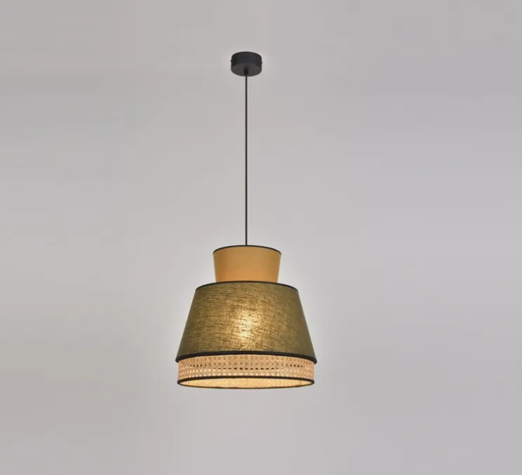 La suspension est composée d’un empilement de 3 abat-jour en lin lavé et cannage. Elle est également équipée d’un cordon textile (1,5m) et d’un pavillon en métal adaptable DCL. Elle mesure 37,5 cm de hauteur et 40cm de diamètre.