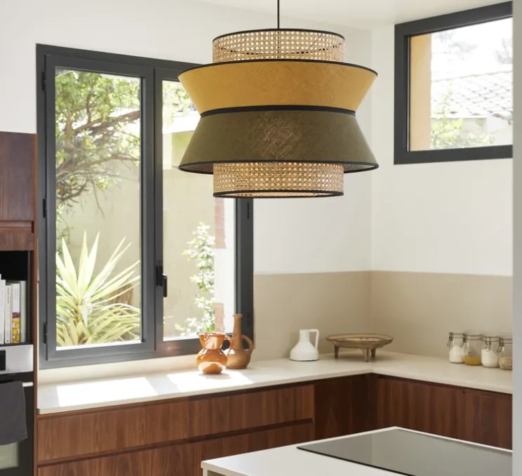Cette suspension est un empilement harmonieux de trois abat-jour, délicatement confectionnés à partir de lin lavé et de cannage, fusionnant le traditionnel et le contemporain avec une élégance inégalée.