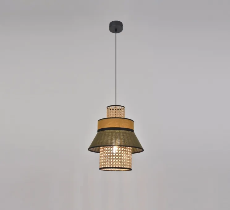 La suspension est composée d’un empilement de 4 abat-jour en lin lavé et cannage. Elle est également équipée d’un cordon textile (1,5m) et d’un pavillon en métal adaptable DCL. Elle mesure 32 cm de hauteur et 30cm de diamètre.