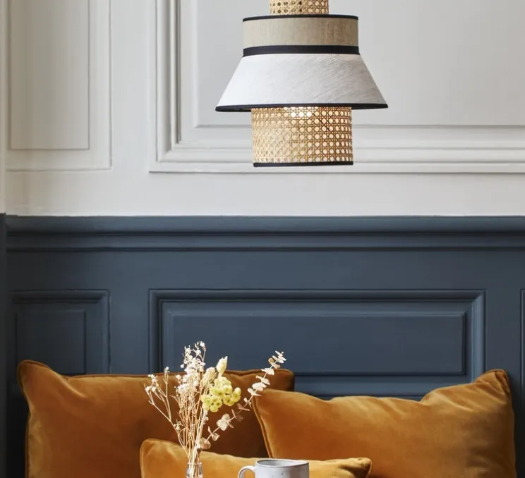 La suspension est composée d’un empilement de 4 abat-jour en lin lavé et cannage. Elle est équipée d’un cordon textile et d’un pavillon en métal adaptable DCL.