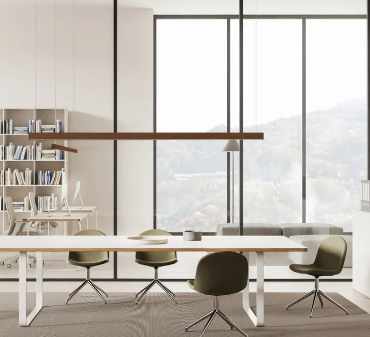 Réalisée en noyer, sa silhouette longiligne et son diffuseur à microprisme en font un luminaire discret et graphique. Elle convient parfaitement à une salle à manger, un bureau ou un espace de travail, où elle structure visuellement l’espace tout en apportant une lumière chaude et précise.