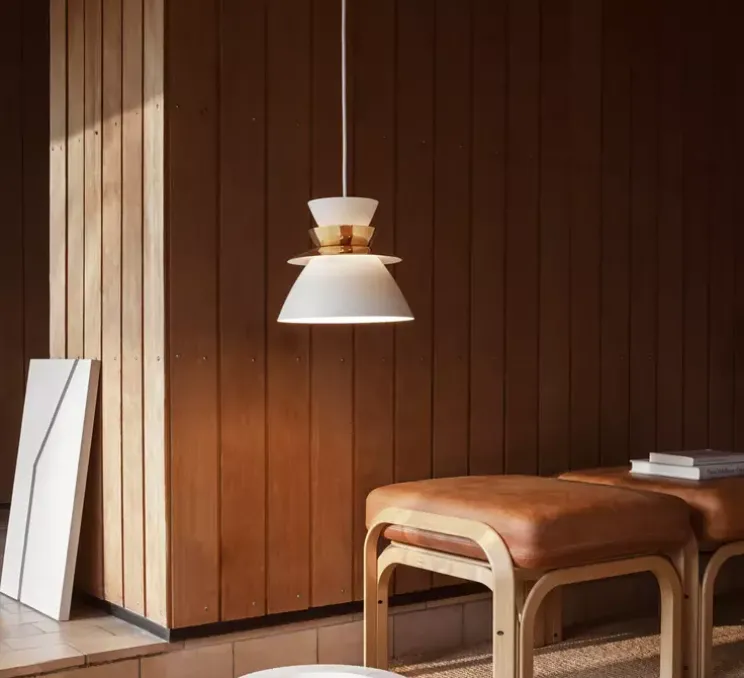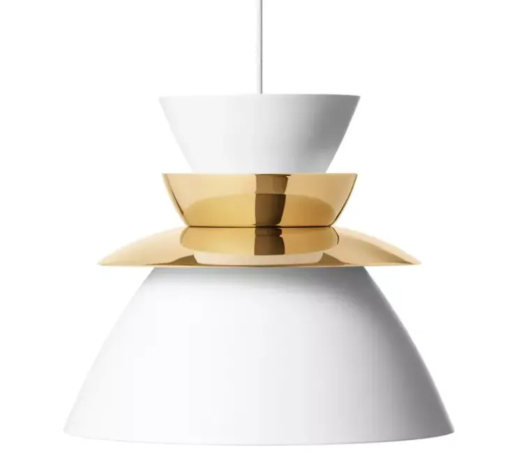 Découvrez la suspension Sundowner 400, finition blanc/laiton, imaginée par le designer Jørn Utzon en 1948 et rééditéee par la maison scandinave Lyfa.