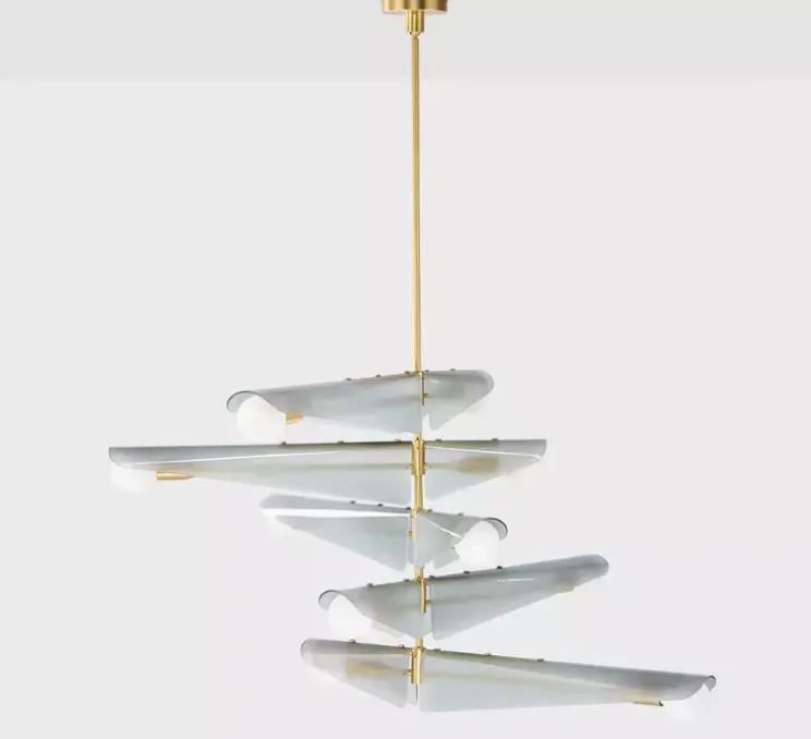 Ses ailes en verre gris, courbées avec délicatesse, se déploient autour d’un cadre en laiton brossé, évoquant la qualité translucide des graines et illuminant chaque espace d’une lueur douce et chaleureuse.
