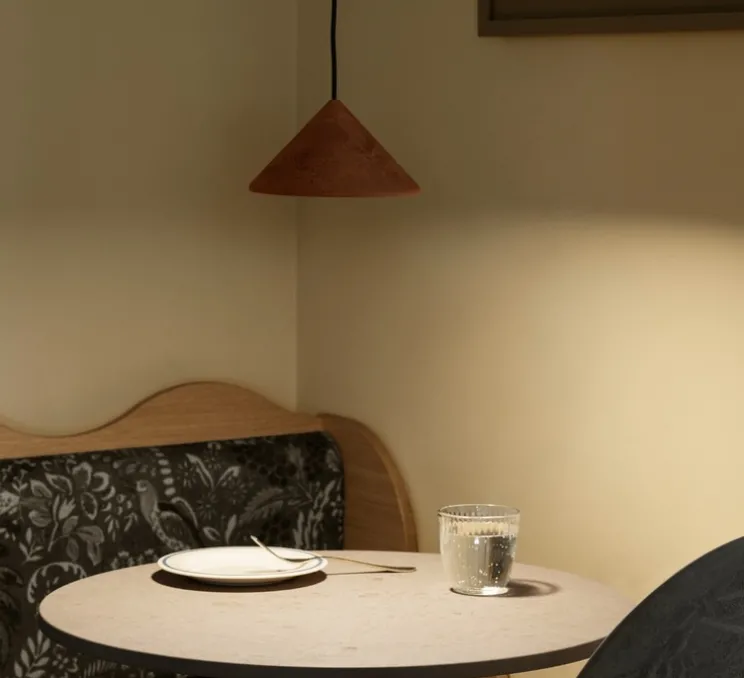 Avec ses lignes coniques épurées et sa finition rouille intense texturée, Terra incarne une esthétique brute et contemporaine. Le matériau Matek™ confère à l’objet une dimension tactile originale, tout en permettant une intégration discrète des éléments techniques. À suspendre seule au-dessus d’une table ou en série dans une cuisine ou un couloir, elle s’intègre