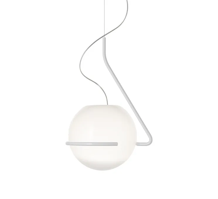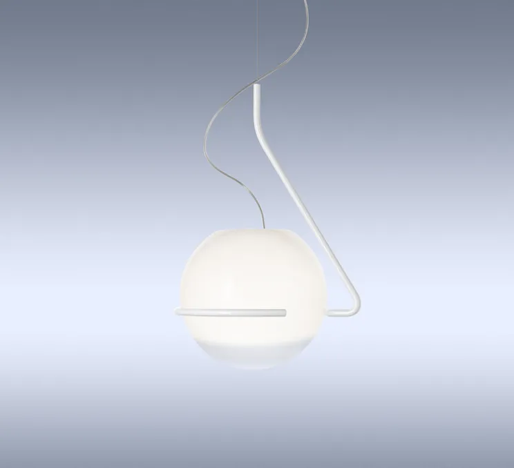 Elle se présente comme un globe en verre entouré par une structure en métal blanc. A la croisée du Good Design et du Radical, ce luminaire met en équilibre ces deux mouvements en opposition. La structure brute encercle le globe en verre opalin dégradé pour allier esprit pop et fonctionnalité.