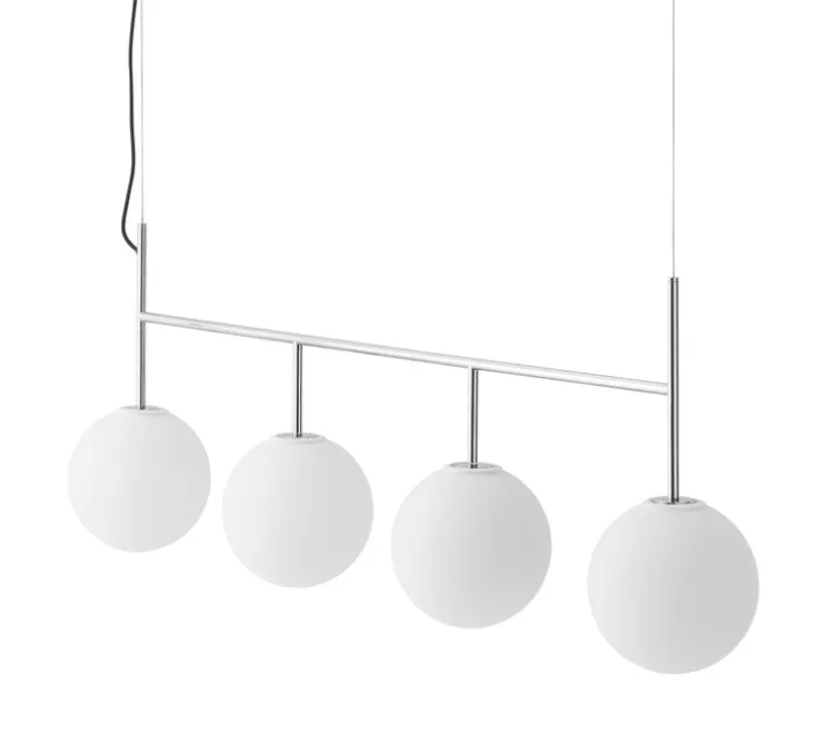 Dotée d’un cadre en acier poli miroir, cette suspension met en valeur une série d’abat-jours sphériques en verre opale, diffusant une lumière homogène à 360°. Son allure minimaliste s’intègre harmonieusement au-dessus d’une table de repas, d’un îlot central ou d’un bureau, apportant une touche moderne et équilibrée. Son câble textile noir de 3 mètres permet un réglage précis de la hauteur pour s’adapter à l’espace.