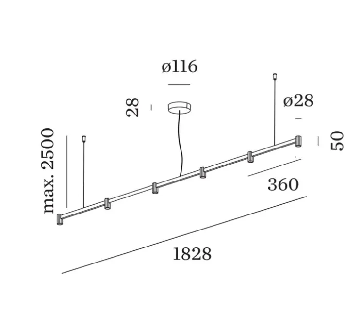 La suspension mesure 182,8cm de longueur pour 5cm de hauteur. Les 6 sources lumineuses sont incluses pour un éclairage total de 3000K, 1200 lm, 16W max.