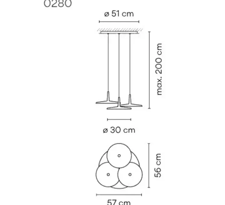 La source lumineuse est intégrée (3x module LED, 9,3W chacun, 2700K, CRI>90, 2147lm, 350mA, variable 1-10V PUSH). Le transformateur est inclus et est nécessaire à la bonne installation et au bon fonctionnement du luminaire. La rosace a un diamètre de 51cm. Les câbles sont ajustables jusqu’à 2m.