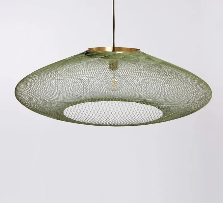 La suspension Ufo est faite de fibres imprégnées de résine, inspirées par des ailes de libellule. Les fibres sont enroulées avec un robot industriel autour d’un moule en motifs géométriques. La structure apparaît comme un OVNI venant de l’au-delà, est en fil de fer et le câble est tressé en noir ou blanc selon vos envies.