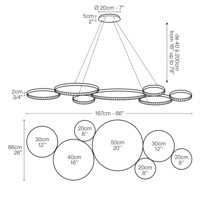 Avec son design épuré, minimaliste et contemporain cette suspension est devenue un luminaire incontournable pour éclairer vos différents espaces qu’il s’agisse d’environnements pour particuliers ou pour professionnels. L’association des 7 cercles permet au luminaire de présenter une forme longiligne pouvant surplomber une grande table à manger ou un bar.