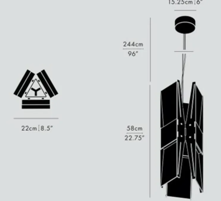 La suspension Vector à 3 panneaux mesure 58cm de hauteur, 22cm de longueur et 22cm de profondeur. Le module Led intégré diffuse une lumière directe et indirecte et propose un mode de variation en coupure de phase. Installation au plafond.