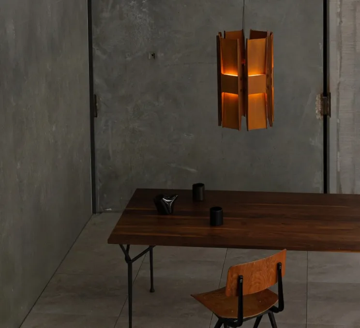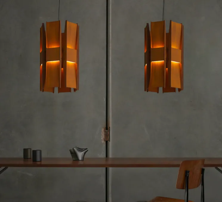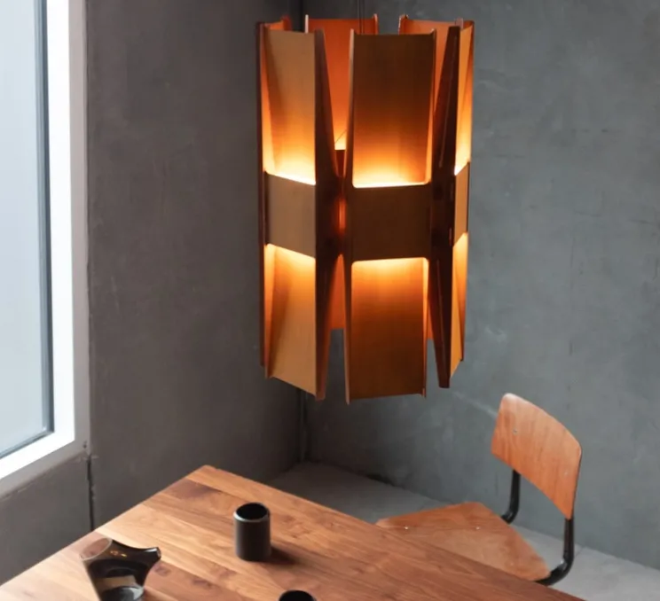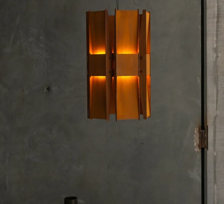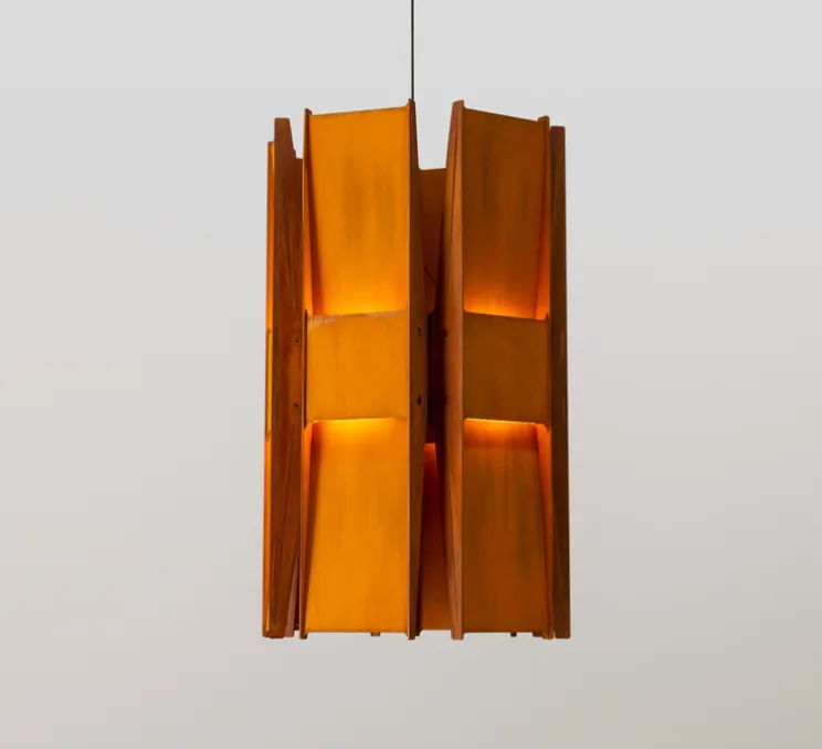 Découvrez la suspension à 6 panneaux Vector, finition rouille, imaginée par le célèbre designer Lukas Peet pour la maison canadienne A-N-D.