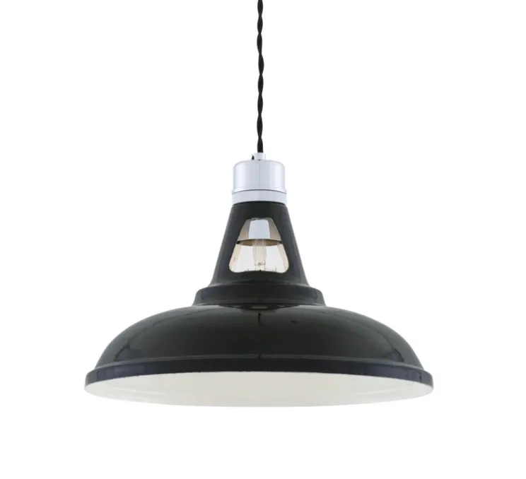Le luminaire mesure 23cm de hauteur et 30,5 cm de diamètre. Le câble de 1m est inclus. Possibilité d’avoir un câble de 2m ou de 3m sur demande. L’ampoule E27 (LED, max 60W) n’est pas incluse. Ce luminaire existe en plusieurs coloris : bronze, noir, noir mat, gris, orange, rouge, blanc, jaune, vert foncé, vert sauge.