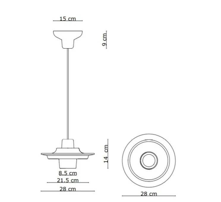 La suspension mesure 28 cm de diamètre et 14 cm de hauteur. La source lumineuse E27, 53W max, n’est pas fournie.