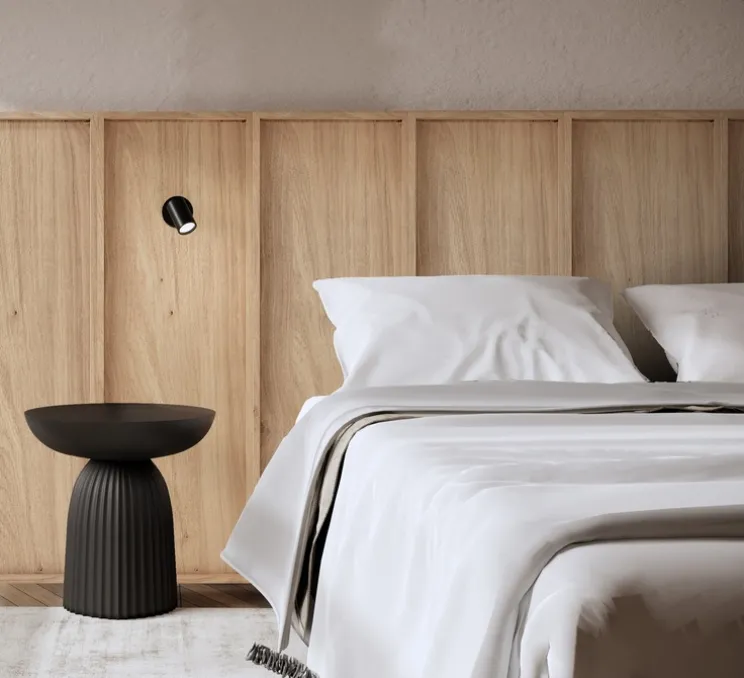 Ensemble, les panneaux de bois et les appliques murales Astro créent une ambiance chaleureuse et élégante dans votre chambre à coucher, alliant fonctionnalité et style avec une touche raffinée.