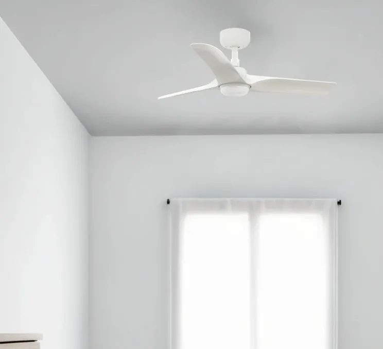Ses pales blanches entourent le moteur, créant un effet visuel léger et épuré. Idéal pour les pièces de moins de 13 m², Hey S s’adapte aux plafonds inclinés et s’intègre harmonieusement dans divers intérieurs.
