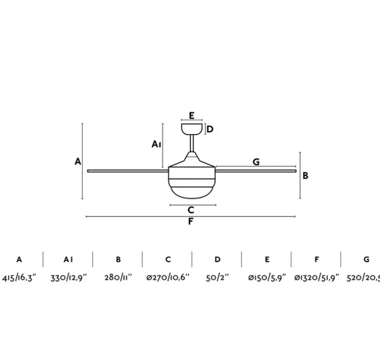 La fixation du ventilateur au plafond est sur rotule. Le ventilateur ICARIA mesure Ø168cm de diamètre, 41cm de hauteur et pèse 9.32 kg. La source lumineuse n’est pas incluse (2 X E27 MAX 15W).